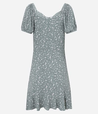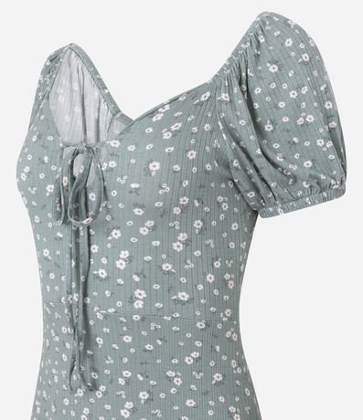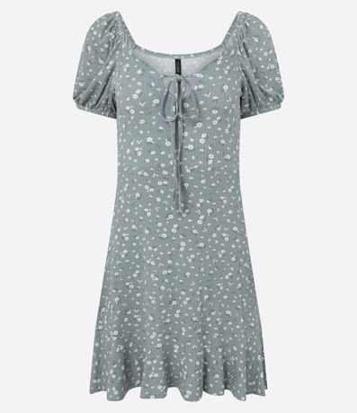 Ref: Vestido curto, godê com manga curta, amarração com recorte vazado no busto e estampa floral liberty.
