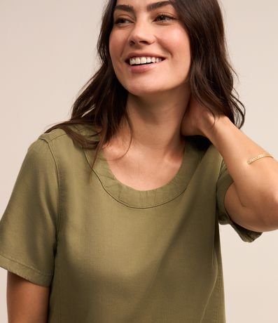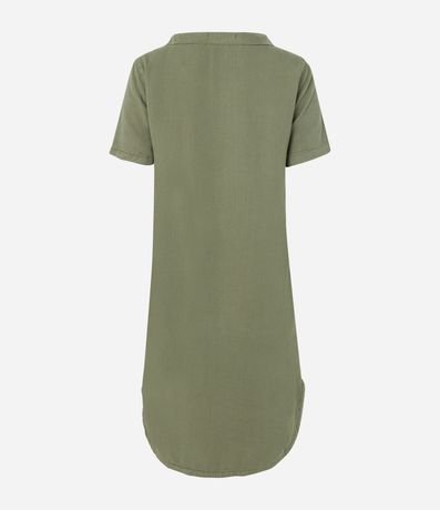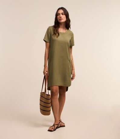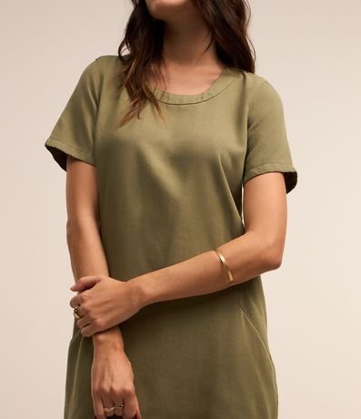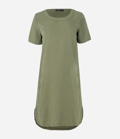 Ref: Vestido com comprimento acima dos joelhos confeccionado em sarja leve com decote canoa, mangas curtas e barra aredondada.