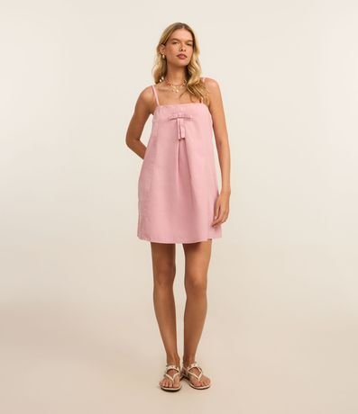 Ref: Vestido feminino curto confeccionado em sarja de algodão certificado bci, decote reto, alças finas ajustáveis, lacinho frontal, pregas frontais e bolsos.