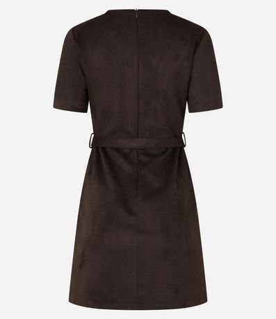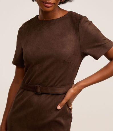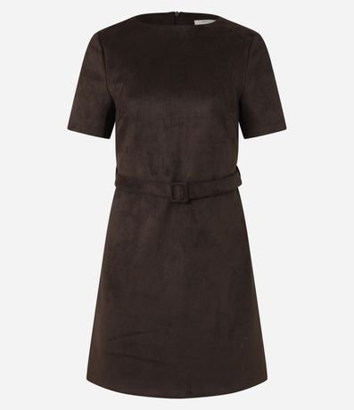 Vestido feminino de modelo curto, confeccionado em suede, com gola redonda e mangas curtas. Possui fechamento por zíper nas costas e acompanha cinto de fivela quadrada para ajuste na cintura.