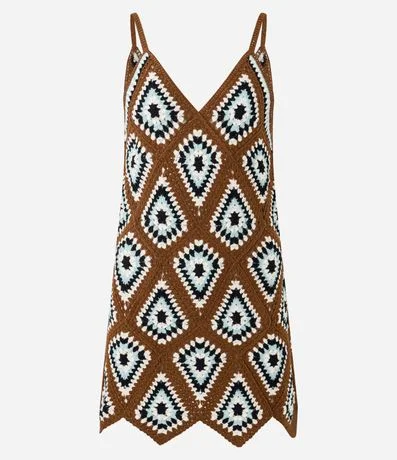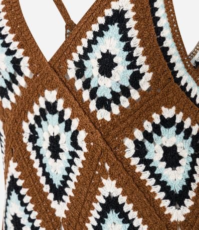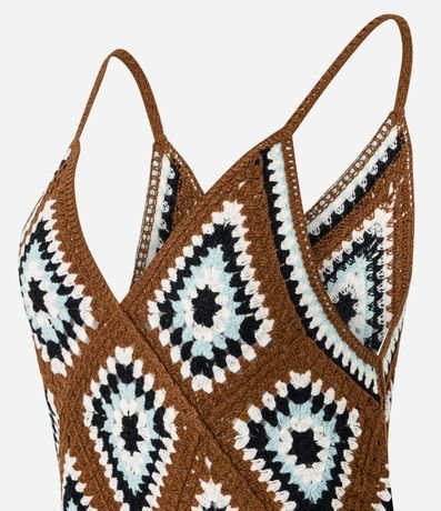 Ref: Vestido curto confeccionado em tricô com aparência de crochê. A peça tem alças finas fixas (sem regulagem), decote V e padrão geométrico.
