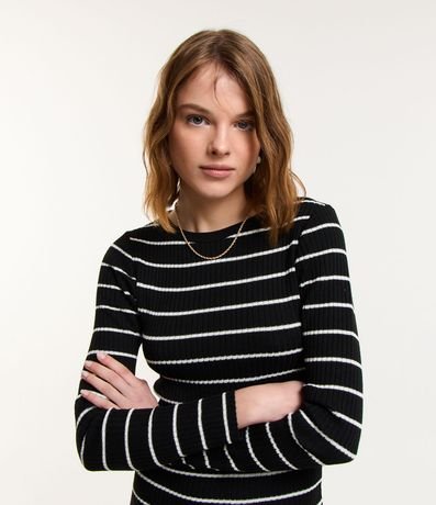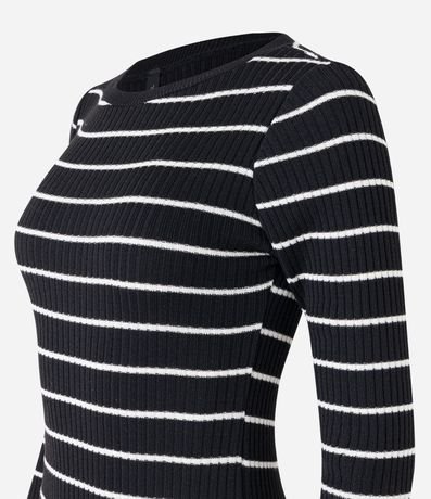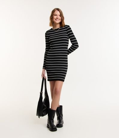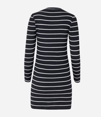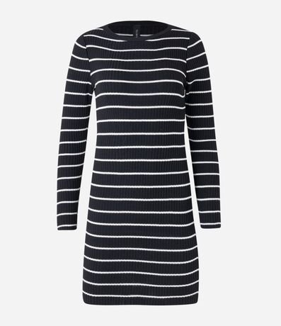 Ref: Vestido curto com manga longa, confeccionado em tricô leve, gola canoa e listras contrastantes.
