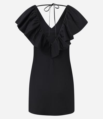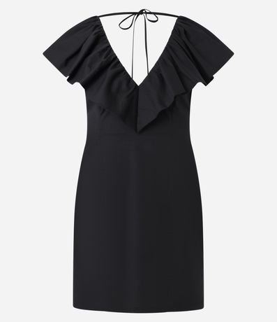 Vestido curto sem manga com babado frente e costas e amarração no pescoço.