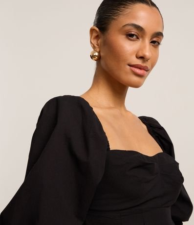 Vestido curto de mangas 3/4 bufantes, confeccionado em tricoline, com decote coração e lastex nas costas, além de barra com recorte franzido. Vestido forrado. Este produto possui algodão certificado BCI em sua composição, além de ter sido produzido através de processos mais sustentáveis com boas práticas ambientais, sendo ambientalmente mais responsável.