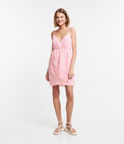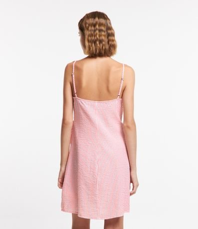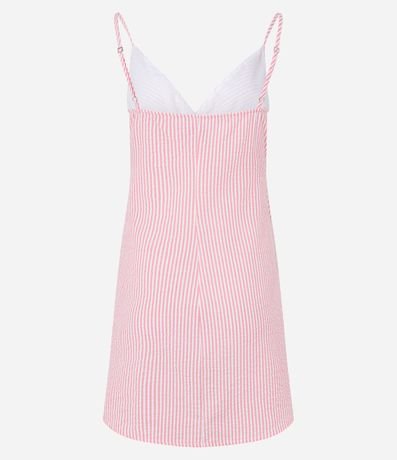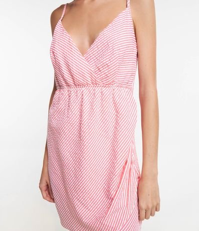Vestido curto, confeccionado em tricoline, alças finas, decote transpassado em v e com listras em fio tinto.
