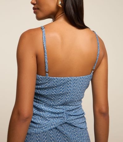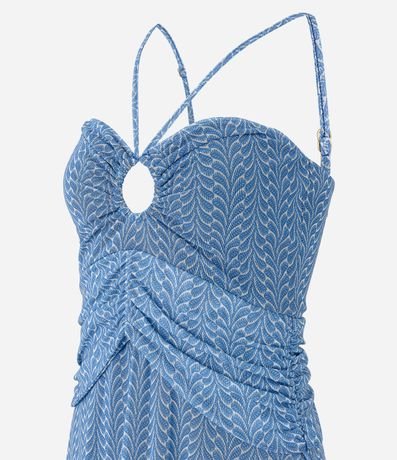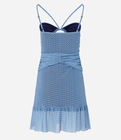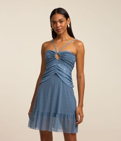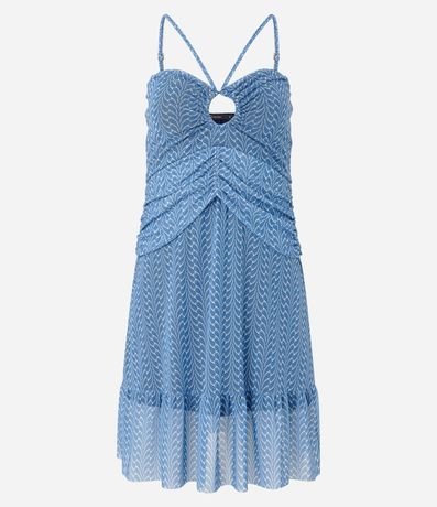 Vesitdo curto em tule com alça fina regulável, decote coração com vazado redondo no busto, franzidos no busto além de barra franzida e estampa abstrata.