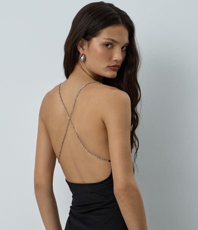 Ref: Vestido curto em tule liso com alças de corrente cruzadas nas costas, trazendo brilho moderno ao visual. Possui decote drapeado e modelagem ajustada que valoriza a silhueta. Ideal para composições noturnas sofisticadas, oferecendo leveza, conforto e estilo para momentos especiais.