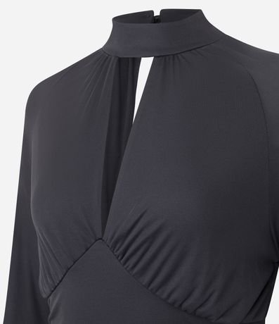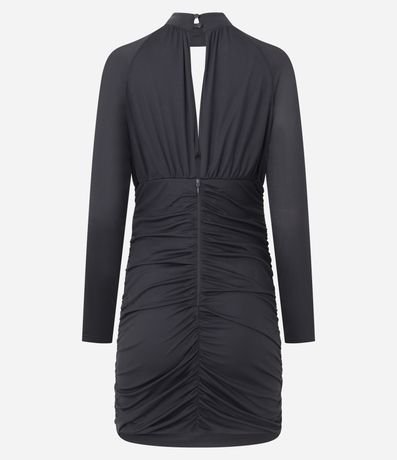 Ref: Vestido curto em tule com modelagem ajustada e mangas longas. Possui gola alta com abertura frontal e drapeados laterais que valorizam a silhueta. Ideal para compor looks sofisticados para festas e produções noturnas com atitude e elegância.