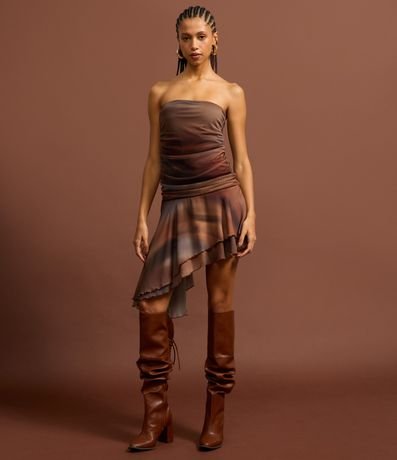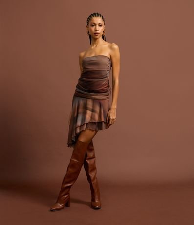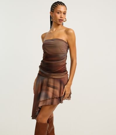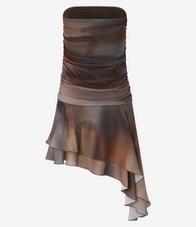 Ref: Vestido tomara que caia, curto com barra em camadas assimétricas, confeccionado em tule e com estampa em efeito manchado.