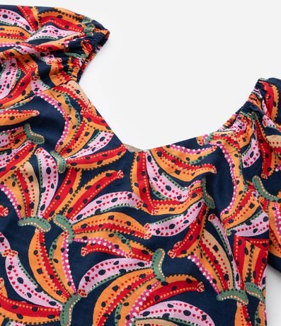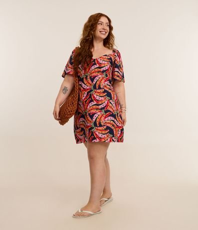 Ref: Vestido curto de viscolinho com estampa de bananas. A peça tem mangas curtas bufantes e decote V.