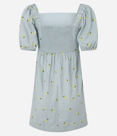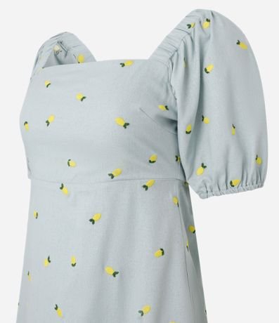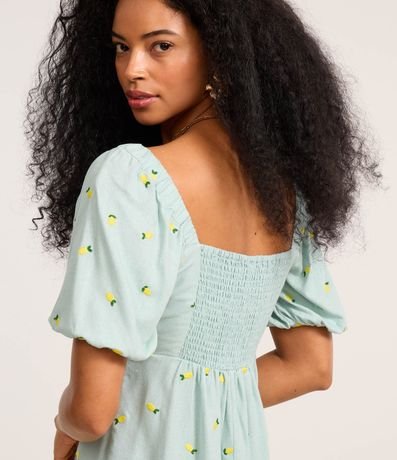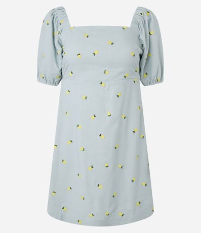 Vestido curto confeccionado em viscolinho com viscose certificada mais sustentável, manga curta bufante e bordadinhos de lima em repetição.