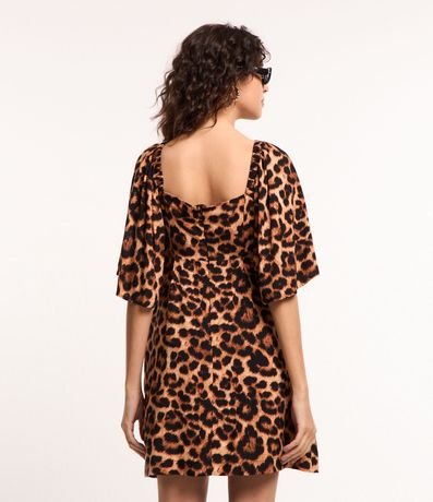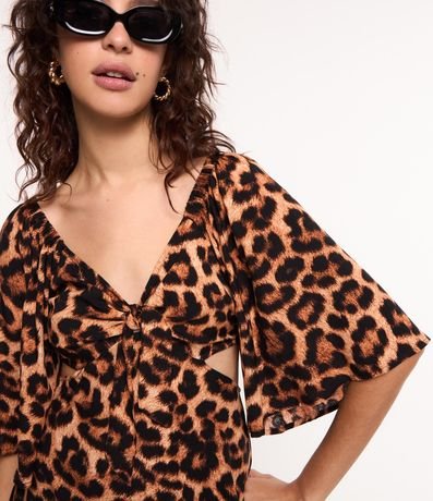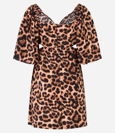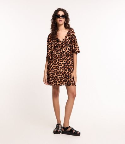 Ref: Vestido curto, em viscose, manga curta ampla, decote v com amarração, recorte vazado nas laterais e estampa animal print, oncinha.