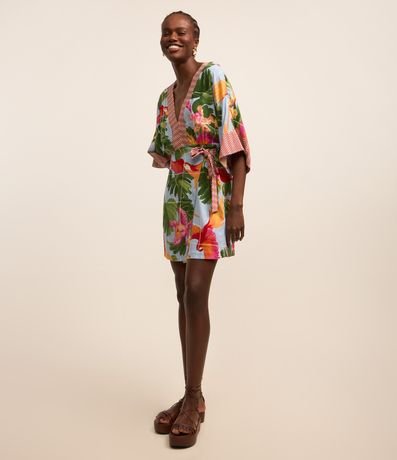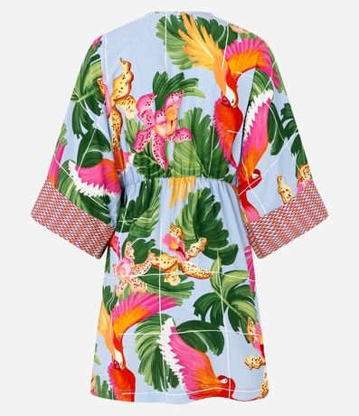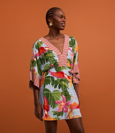 Vestido curto com manga soltinha, decote V, confeccionado em viscose e com estampa tropical com araras e folhagens.