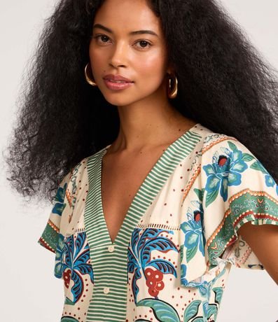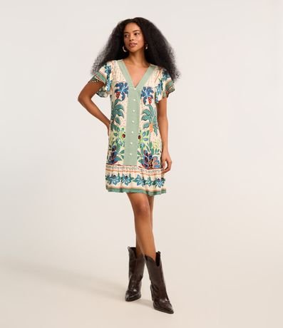Ref: Vestido curto, evasê, estilo bata com manga curta soltinha, confeccionada em viscose mais sustentável e estampa tropical.