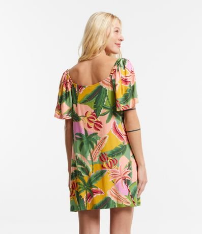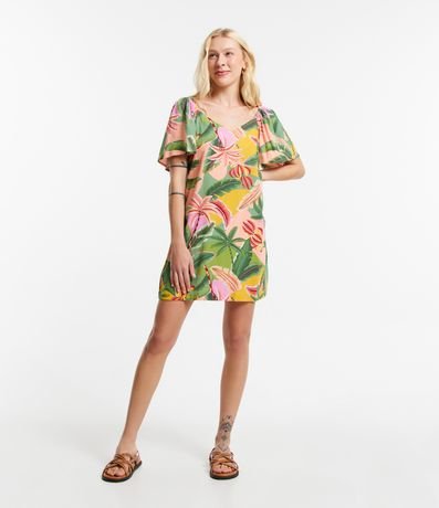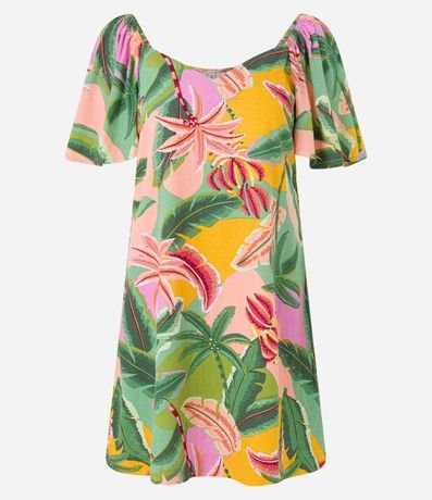 Vestido Curto em Viscose com Linho com Estampa Folhagens