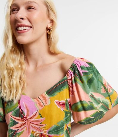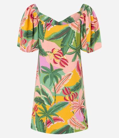 Vestido curto, manga soltinha, elástico nos ombros, estampa folhagens e confeccionada em viscose e linho.