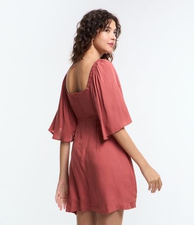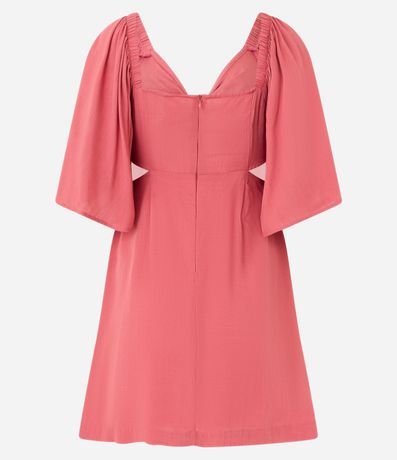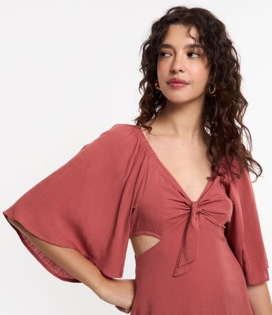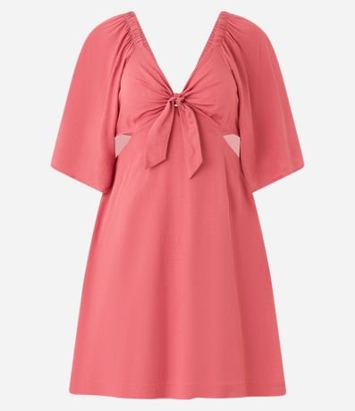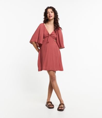 Ref: Vestido curto, decote v com amarração no busto, manga curta ampla, recorte vazado na lateral e fechamento por zíper nas costas.