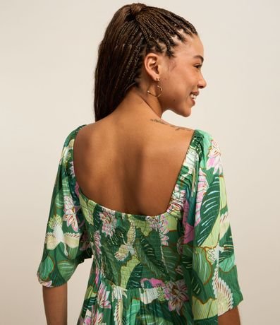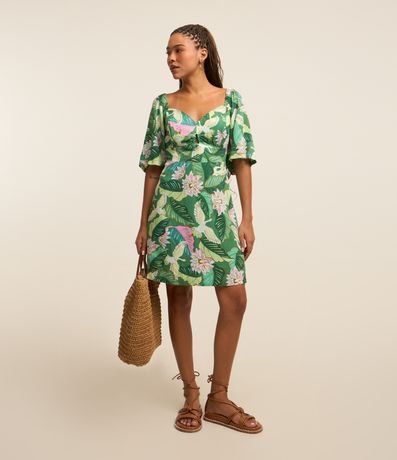Vestido Curto em Viscose com Manga Evasê e Estampa Garças