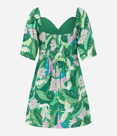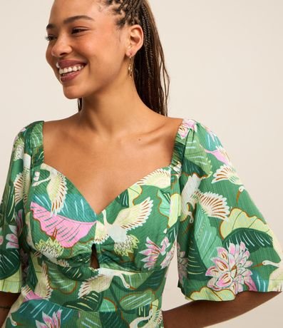 Vestido curto com mangas evasê, recorte vazado no busto, soltinho, confeccionado em viscose mais sustentável e estampa garças.