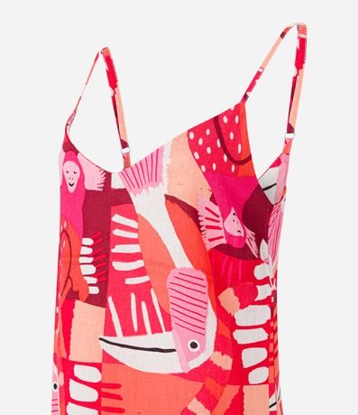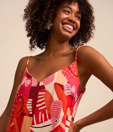 Ref: Vestido curto com alcinhas finas reguláveis, confeccionado em viscose e linho, decote V e estampa em repetição de bichinhos da selva.
