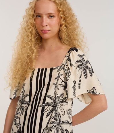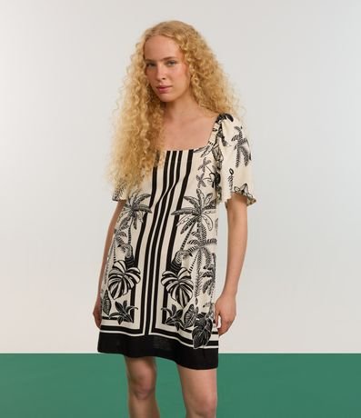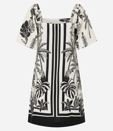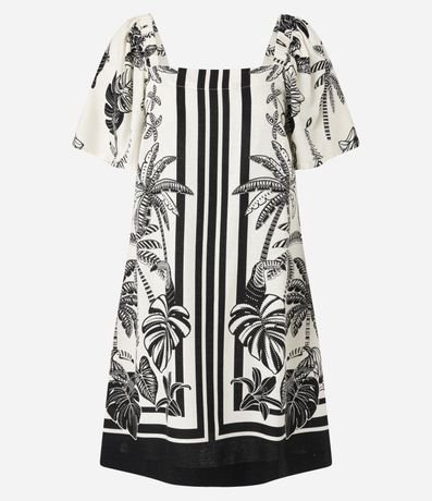 Ref: Vestido curto, confeccionado em viscose certificada mais sustentável, manga curta soltinha e estampa de folhagens.