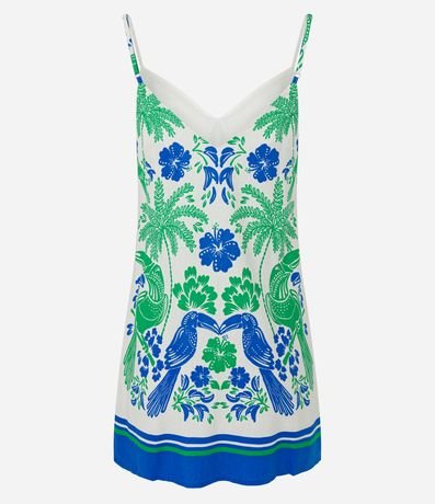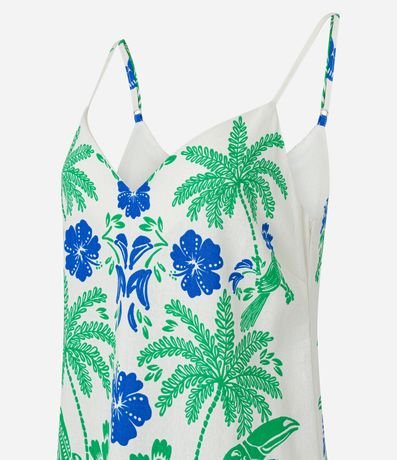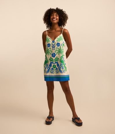 Ref: Vestido curto com alcinhas finas, confeccionada em viscose e linho e estampa estilo tropical com folhagens.