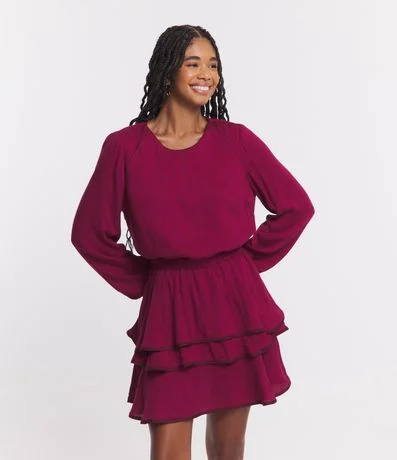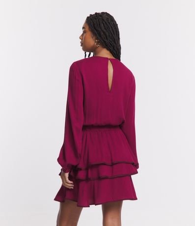 Vestido curto, manga longa, fechamento gota com botãozinho na gola, elástico na cintura, babados na saia e detalhe contrastante.