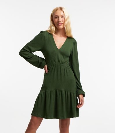 Vestido com comprimento acima dos joelhos confeccionado em viscose de malha texturizada e mangas longas. Possui pregas nas cavas além de recortes horizontais e barra franzida.