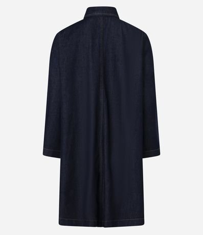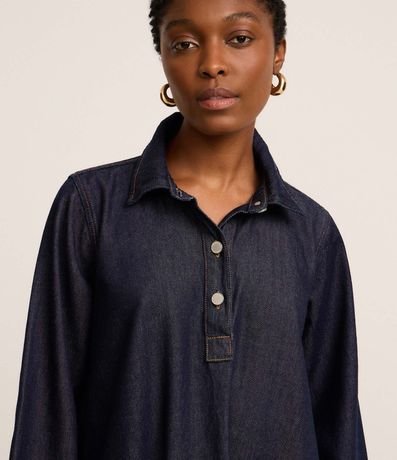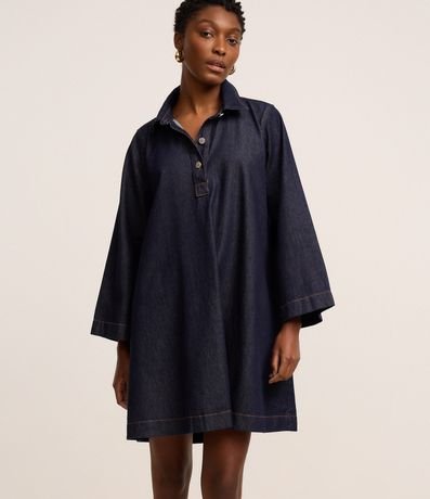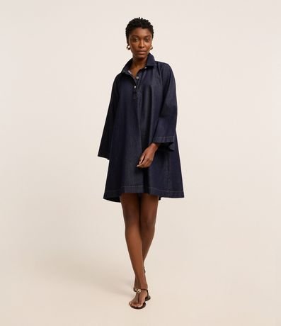 Vestido feminino confeccionado em jeans de algodão certificado bci, curto no modelo evasê, peça com gola alta, colarinho com abotoamento triplo e manga longa.
