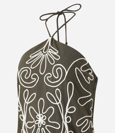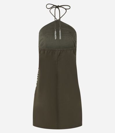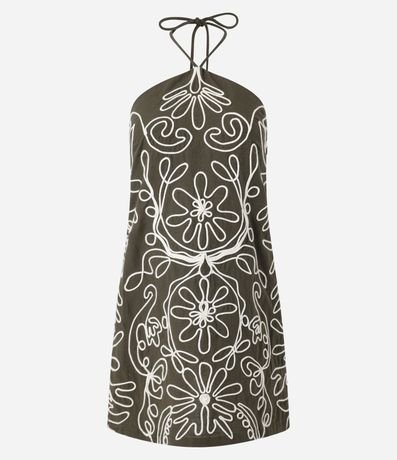Ref: Vestido curto confeccionado em algodão e linho. De estilo frente única, a peça possui amarração no pescoço e bordado em corda.