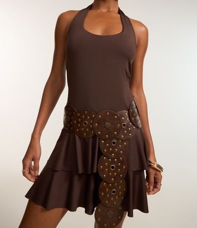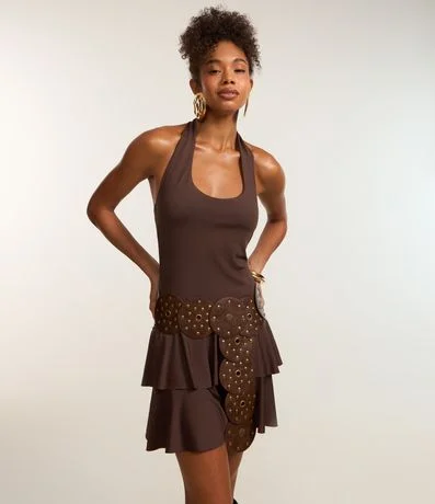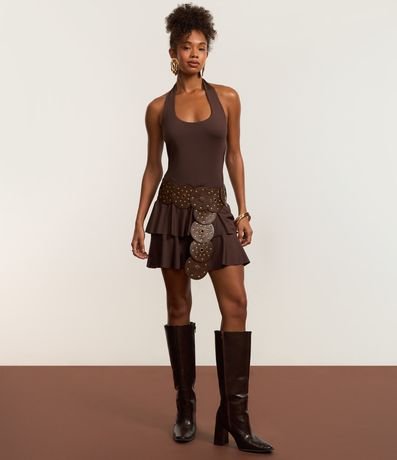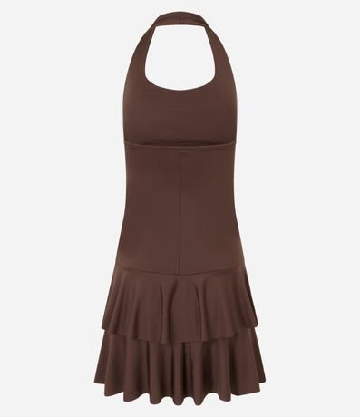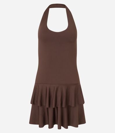 Ref: Vestido curto confeccionado em microfibra, decote frente única arredondado, abertura nas costas e babados na saia.