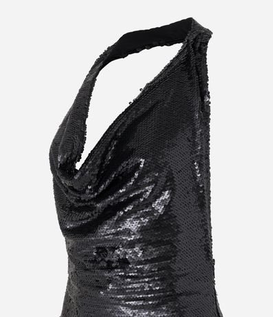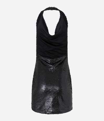 Vestido curto, modelo frente única, confeccionado em malha com paetês. O decote drapeado e as costas abertas são o glamour deste vestido!