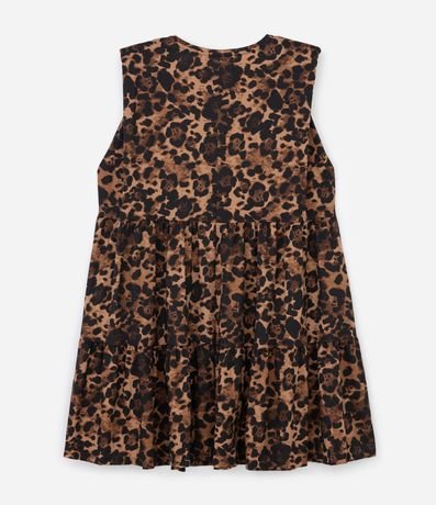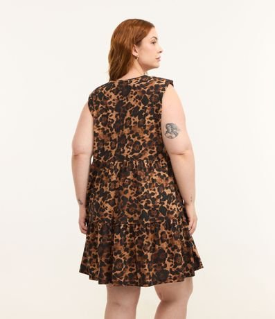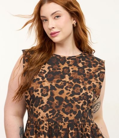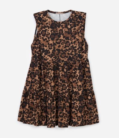 Ref: Vestido curto confeccionado em malha de algodão BCI e estampado de oncinha. O vestido tem gola redonda, ombros estilo muscle tee e babados maria.