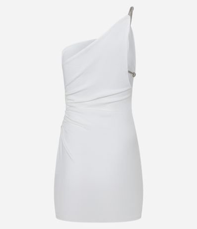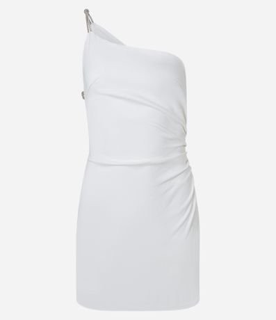 Vestido curto com decote ombro único e alcinhas de strass. Possui abertura vazada na lateral também com alcinha de strass. Confeccionado em bengaline.