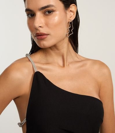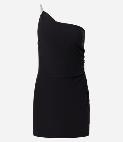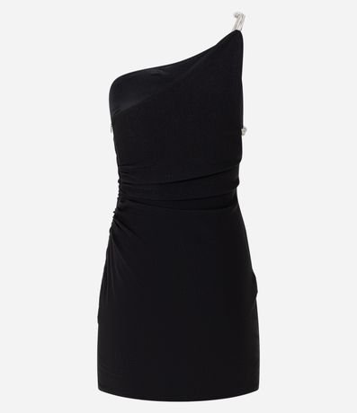 Vestido curto com decote ombro único e alcinhas de strass. Possui abertura vazada na lateral também com alcinha de strass. Confeccionado em bengaline.