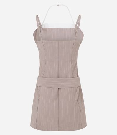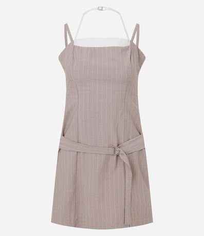 Vestido feminino confeccionado em viscose certificada através de boas práticas ambientais. O modelo é curto e apresenta alças finas duplas, sendo uma delas presa atrás do pescoço. Possui decote reto estruturado e tecido com listras verticais discretas. Acompanha faixa larga do mesmo tecido, amarrada lateralmente.