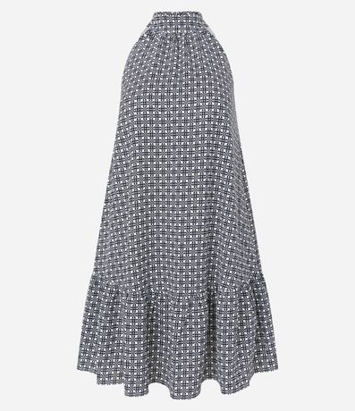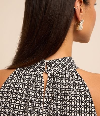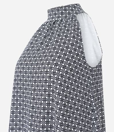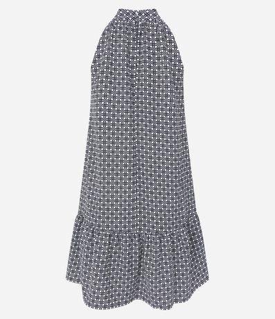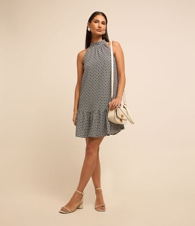 Ref: Vestido com comprimento acima dos joelhos com golinha alta, sem mangas, abertura traseira por gota, cavas americanas, recorte franzido na barra além de estamparia de gravataria. Possui tecido em efeito airflow que confere um visual amassado à peça.