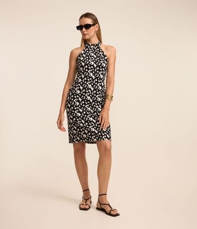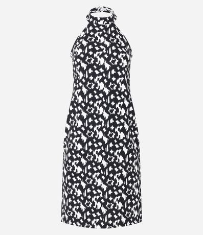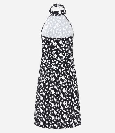 Vestido curto sem mangas confeccionado em crepe com gola halter e estampa abstrata.