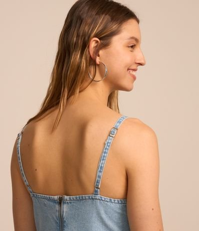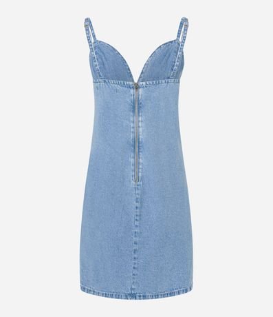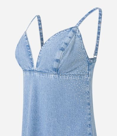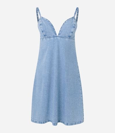 Vestido curto de alcinhas finas reguláveis confeccionado em jeans com decote V, abertura traseira por zíper, busto recortado e pedrarias brilhantes de strass nos lados do busto.