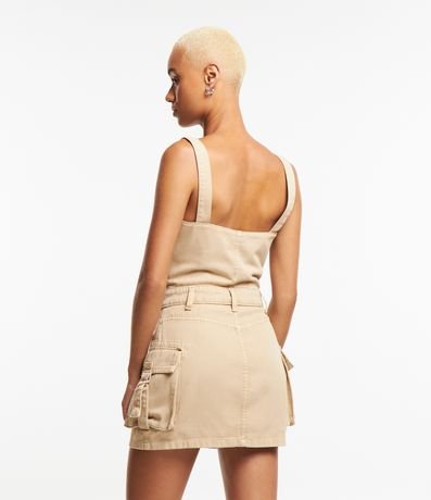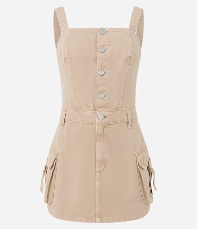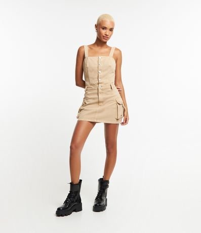 Ref: Vestido com comprimento acima dos joelhos confeccionado em sarja com decote quadrado e sem mangas. Possui passantes na cintura e bolsos cargo com faixas com fivelas aplicadas.