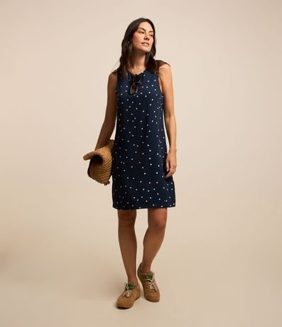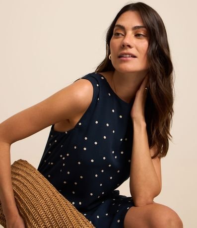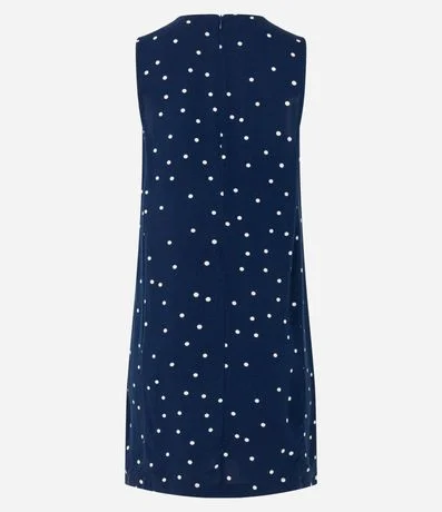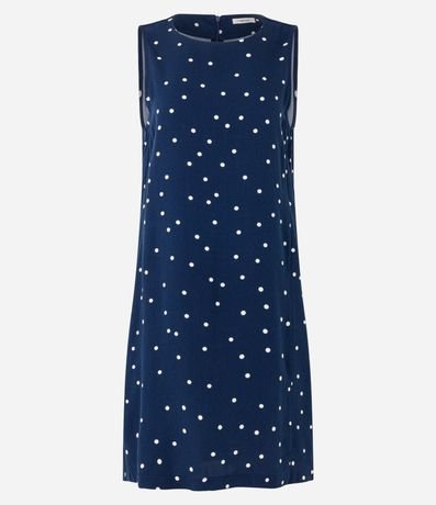 Ref: Vestido reto curto, sem mangas, confeccionado em viscose com gola redonda com fechamento por zíper e estamparia de poás - bolinhas - por toda a peça.