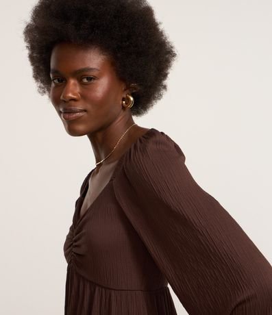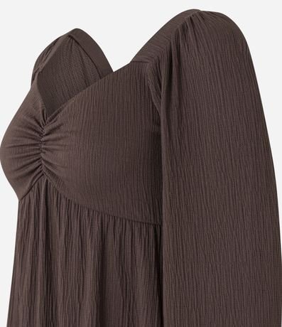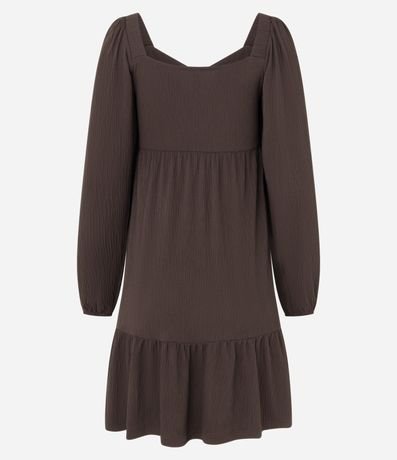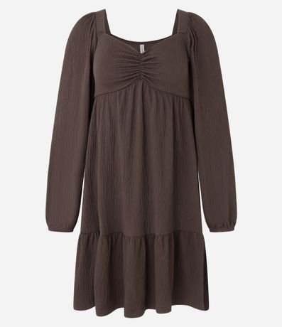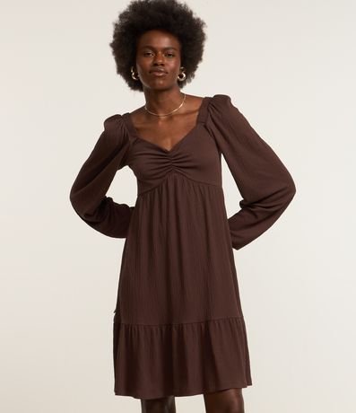 Vestido curto com decote coração, confeccionado em viscose mais sustentável e texturizado. Possui franzido no busto e babado na barra.