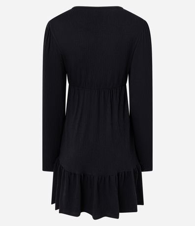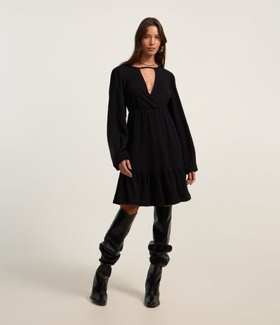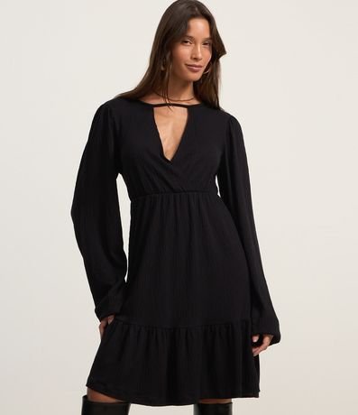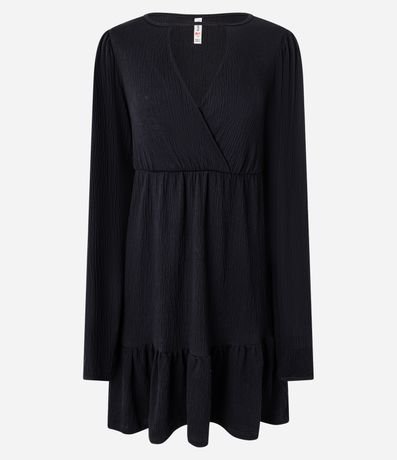 Ref: Vestido curto com manga longa, confeccionado em viscose texturizada, decote transpassado e babado na saia.