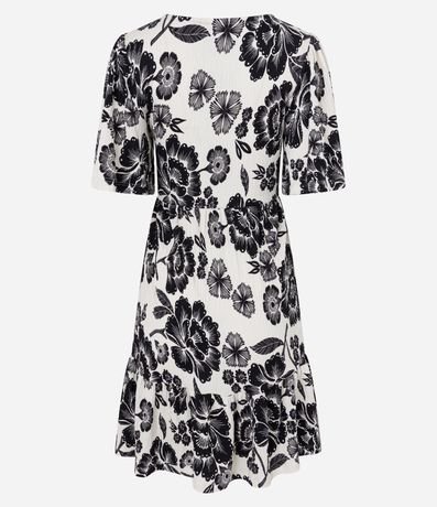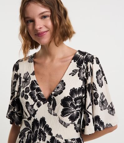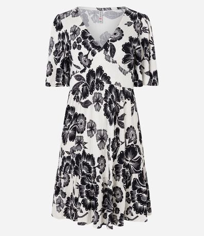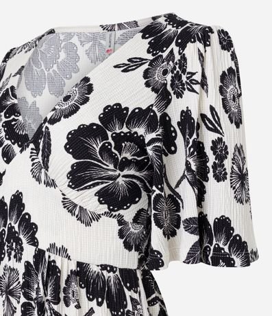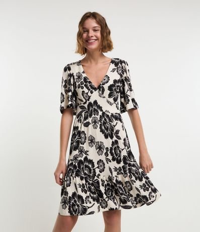 Ref: Vestido curto com mangas curtas godê, decote v com recortes no busto, confeccionado em viscose, texturizado e com estampa floral.