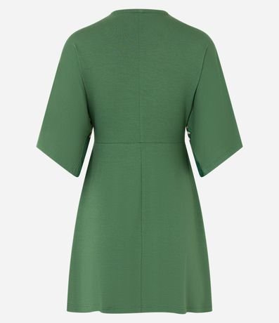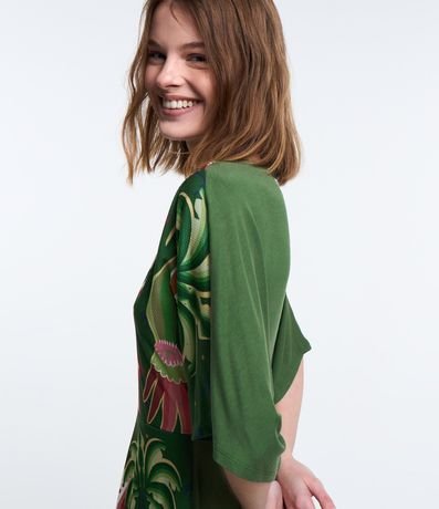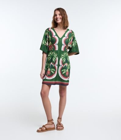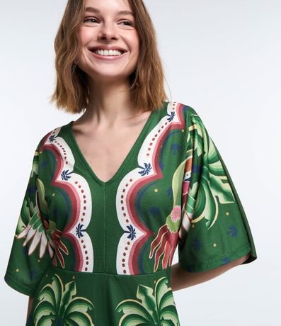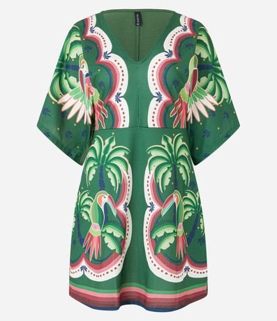 Ref: Vestido curto com textura, mangas curtas soltinhas e estampa frontal, tropical com tucanos.