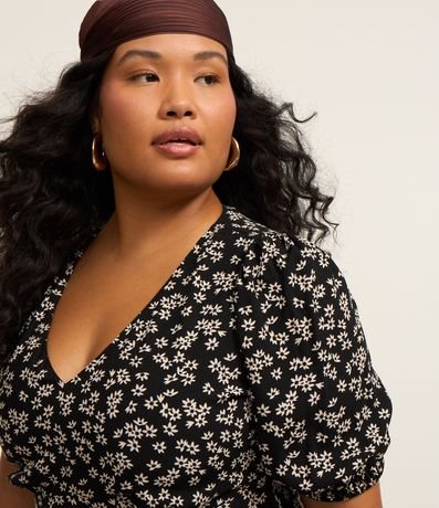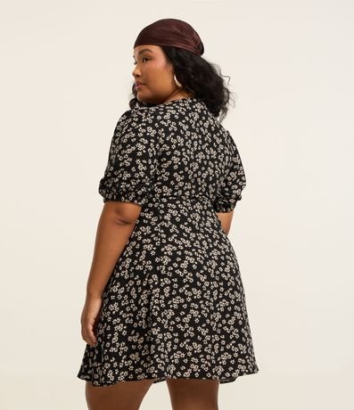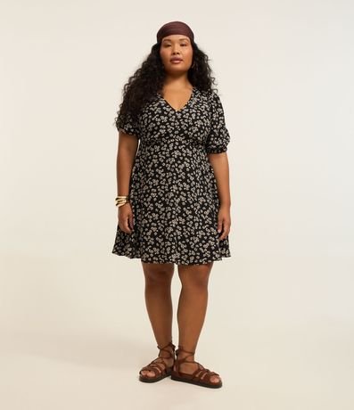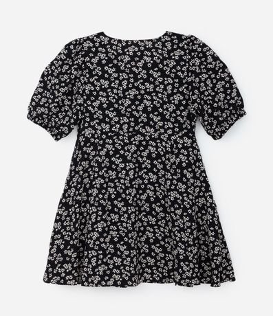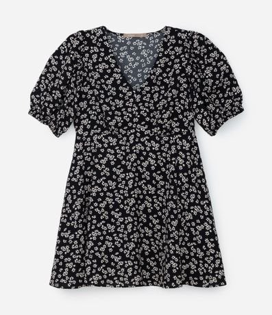 Ref: Vestido curto confeccionado em crepe estampado de mini flores liberty. O vestido tem decote V e mangas curtas bufantes.