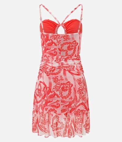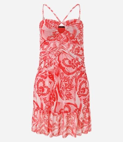 Vestido curto em tule com drapeado e decote de gota na frontal, estampa étnica.