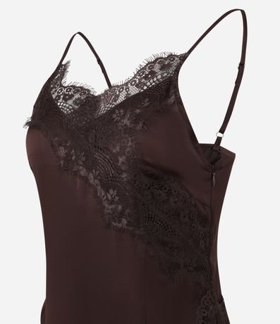 Vestido feminino confeccionado em cetim, possui decote v, alças finas ajustáveis e detalhes em renda.