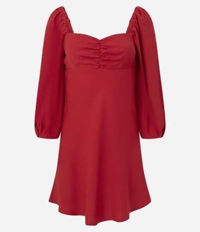 Vestido feminino em crepe, com comprimento curto e modelagem soltinha. Possui mangas longas bufantes que criam volume, decote coração e lastex nas costas, garantindo melhor ajuste, conforto ao vestir e versatilidade para o uso diário.