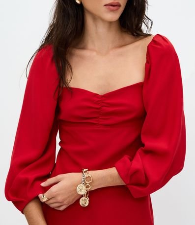 Vestido em Crepe com Manga Bufante e Decote Coração